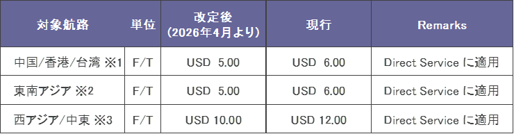 ②弊社の香港経由Global Service利用の場合、向地に限らずUSD 5.00/FTが適用されます。
