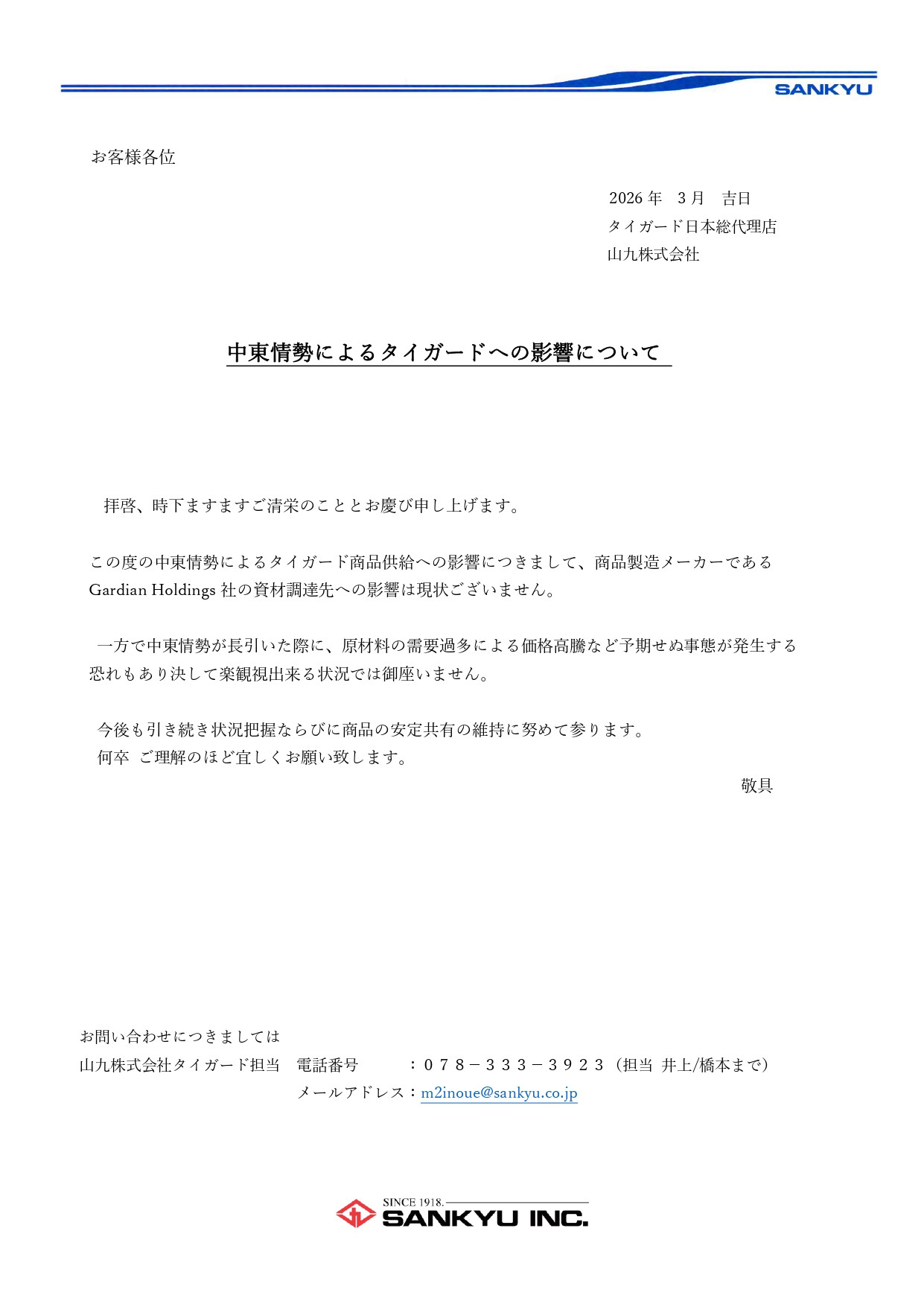 【ご案内】中東情勢によるタイガードへの影響について
